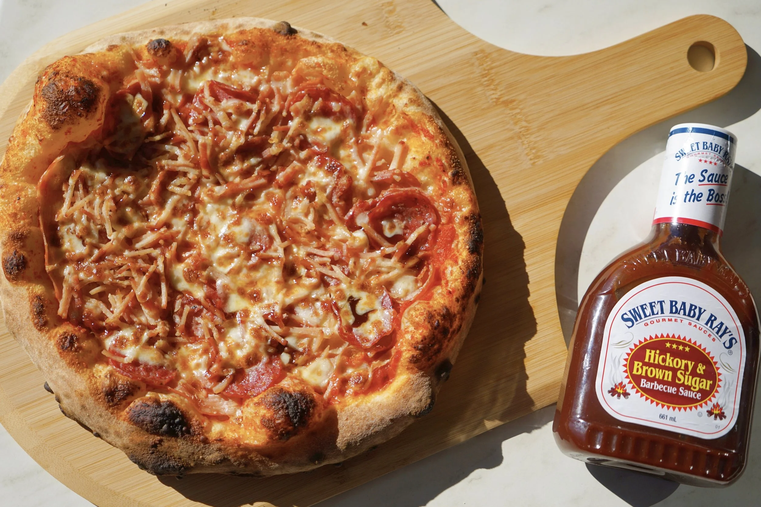 Pizza sauce, mozzarella, chicken, bacon, pineapple, onion, BBQ sauce