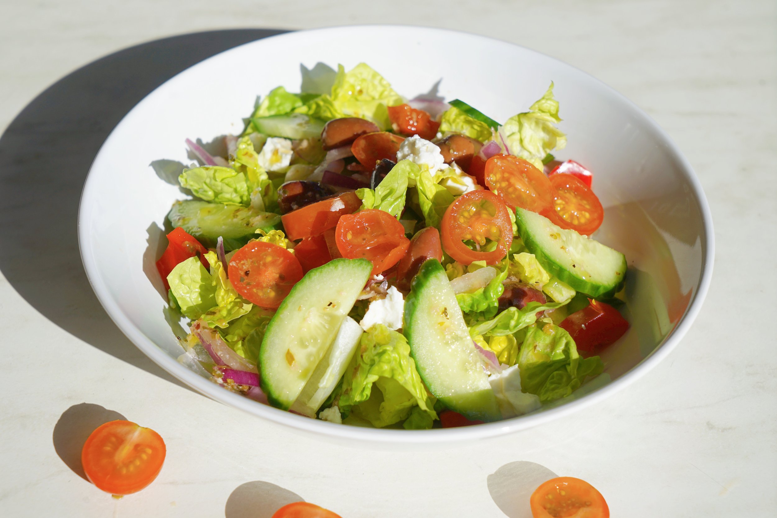 Cos lettuce, tomato, cucumber, capsicum, red onion, feta, olives and Greek dressing