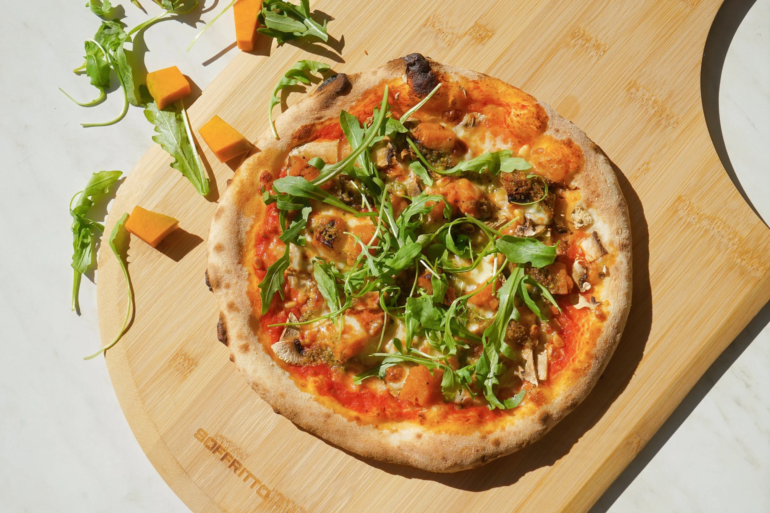 Pizza sauce, mozzarella, roasted pumpkin, mushroom, pine nuts, pesto and rocket
